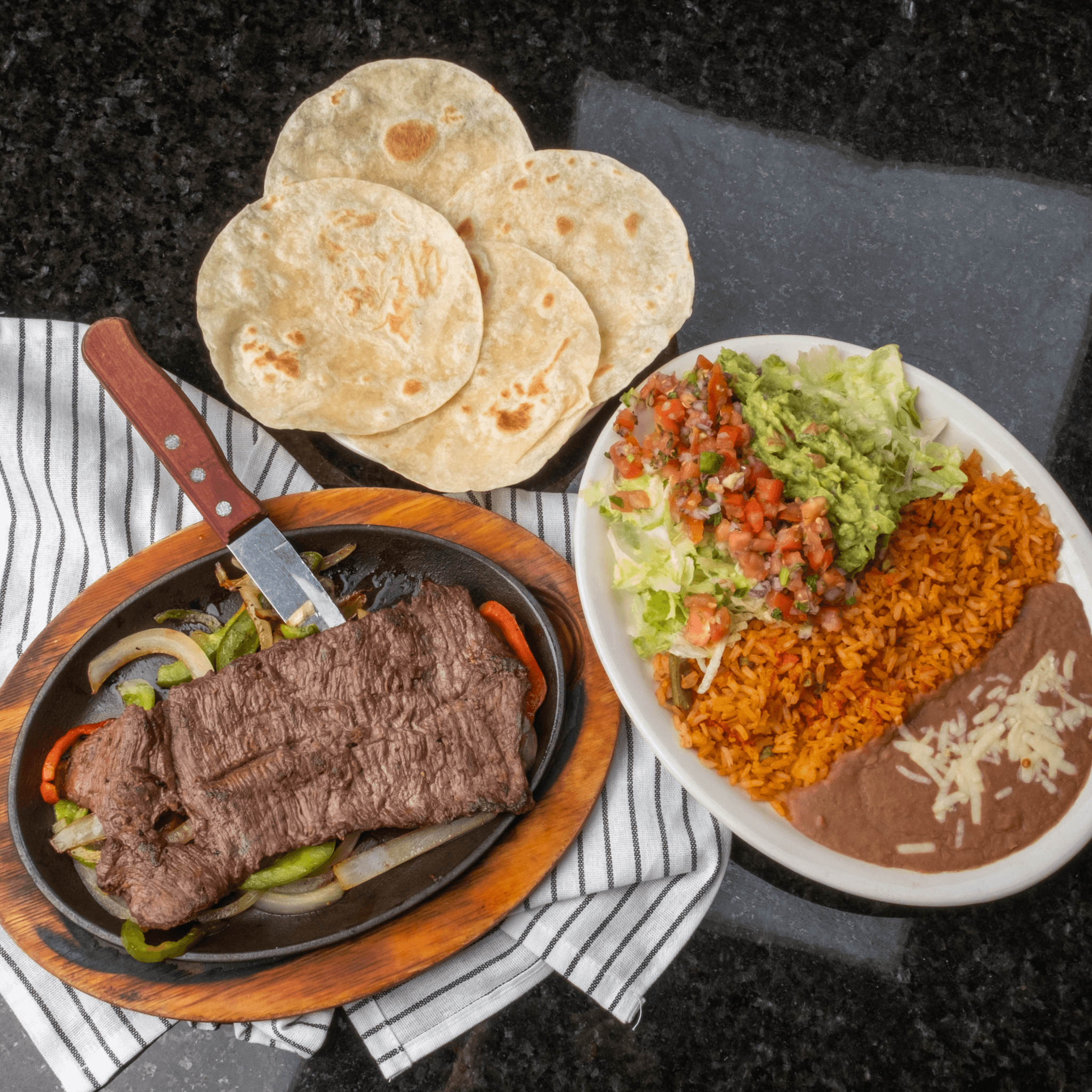 Steak or chicken strips cooked on the grill with onions, bell peppers and tomatoes served with rice, beans, pico de gallo, sour cream, guacamole, and tortillas