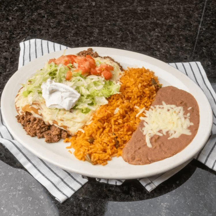Flour tortilla filled with beef or chicken, beans, and rice, topped with chile con carne, and cheese then served with lettuce, tomatoes, and sour cream
