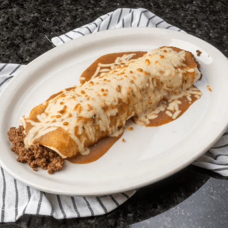 Chicken or beef burrito topped with red sauce and cheese