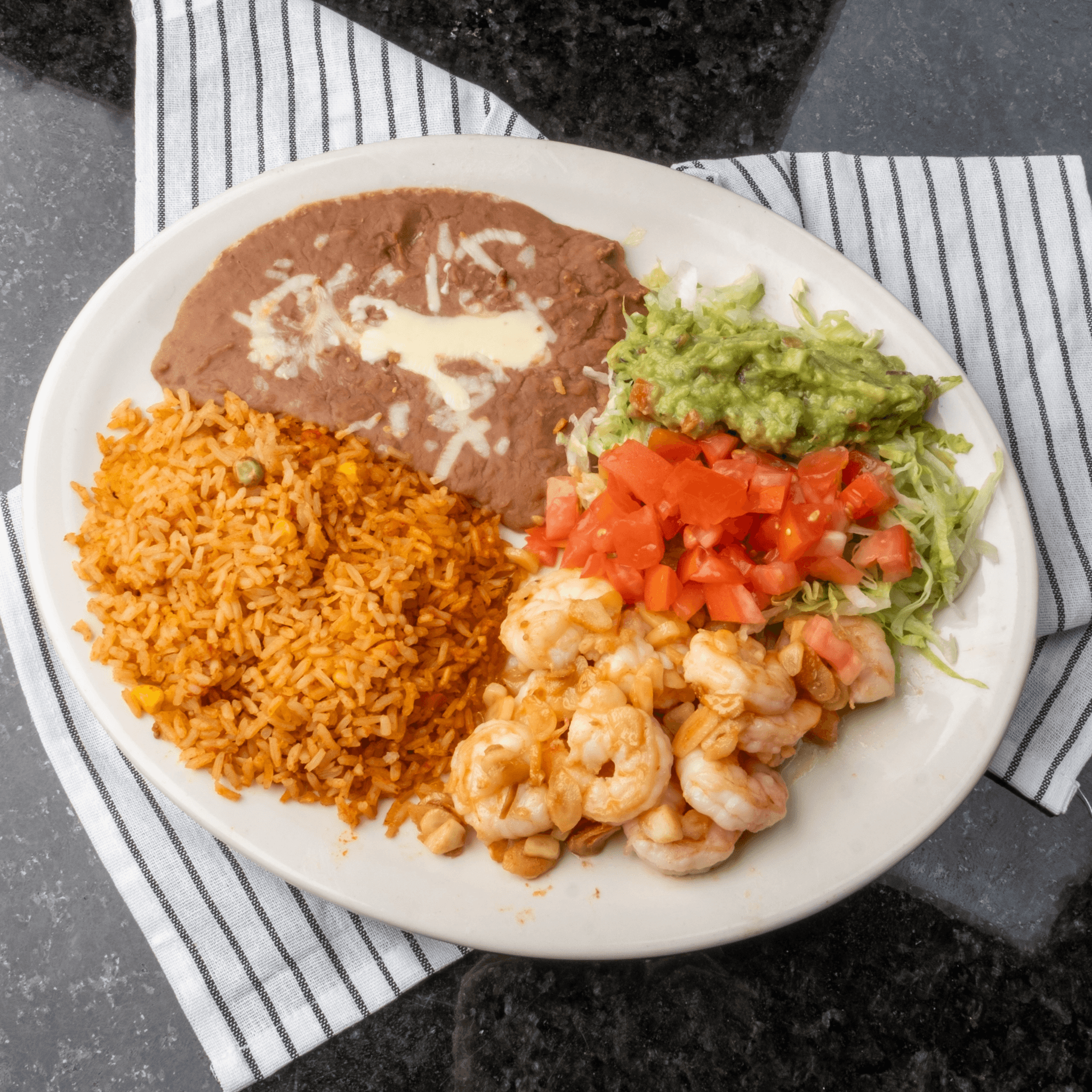 Shrimp cooked in buttery garlic sauce served with rice, beans and guacamole salad