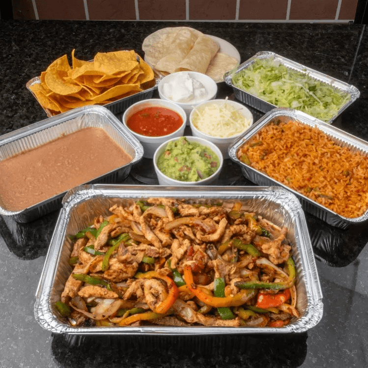 Steak or chicken cooked on the grill with bell pepper, onions and tomatoes served with rice, beans, lettuce, guacamole, sour cream, pico de gallo, shredded cheese and tortillas, for four people